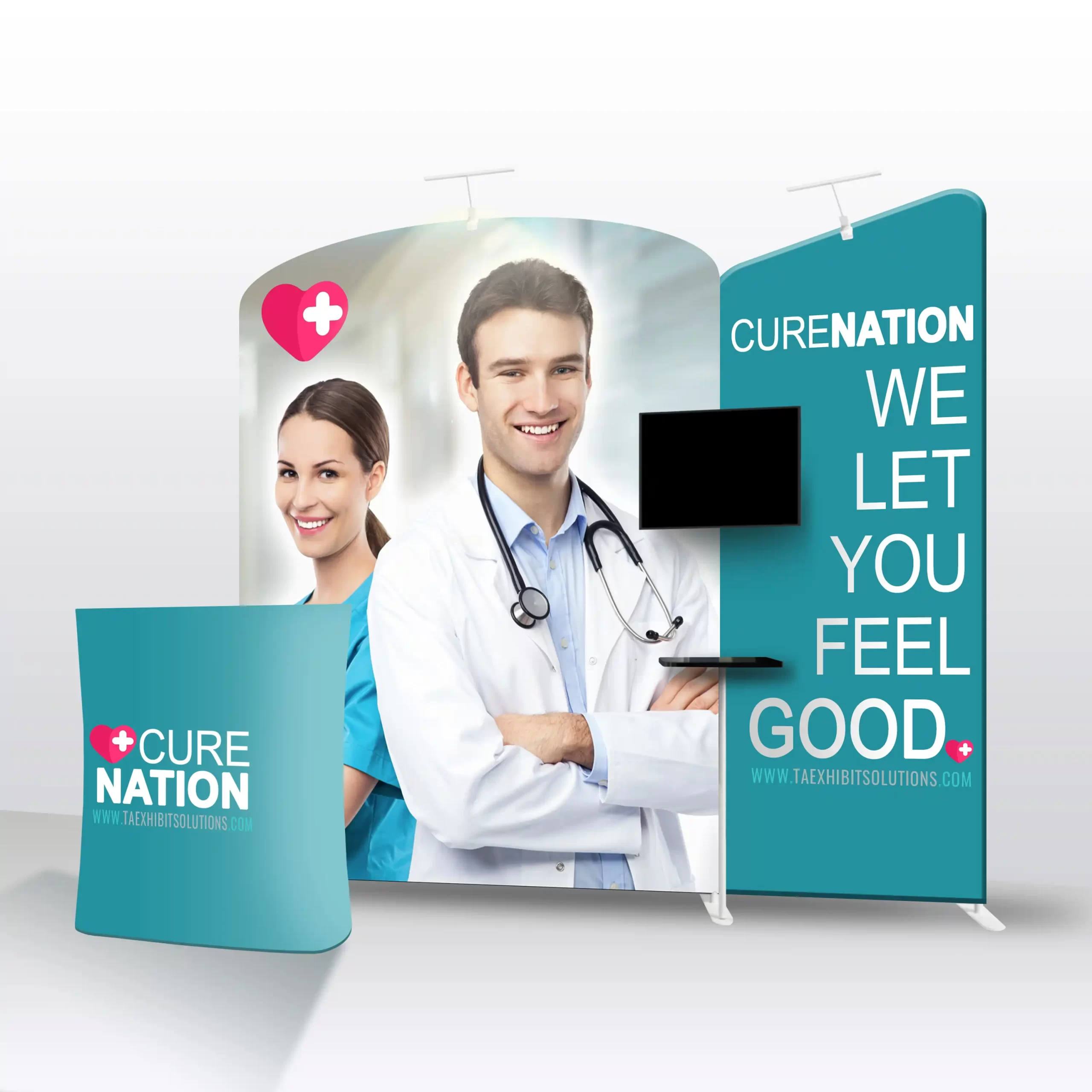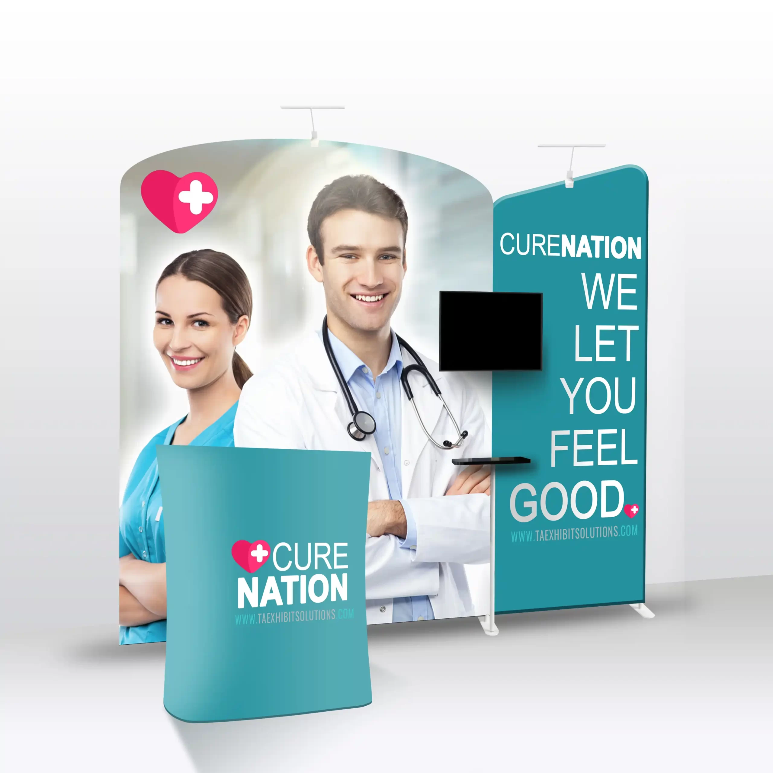 Designed for maximum engagement, this standout booth features a mix of flat and angled backwall displays, a literature and brochure stand, a fabric shelf, a podium (with a convenient carrying case), a TV monitor bracket, and a set of two LED light fixtures. Make a lasting impression with a booth that captivates any audience!